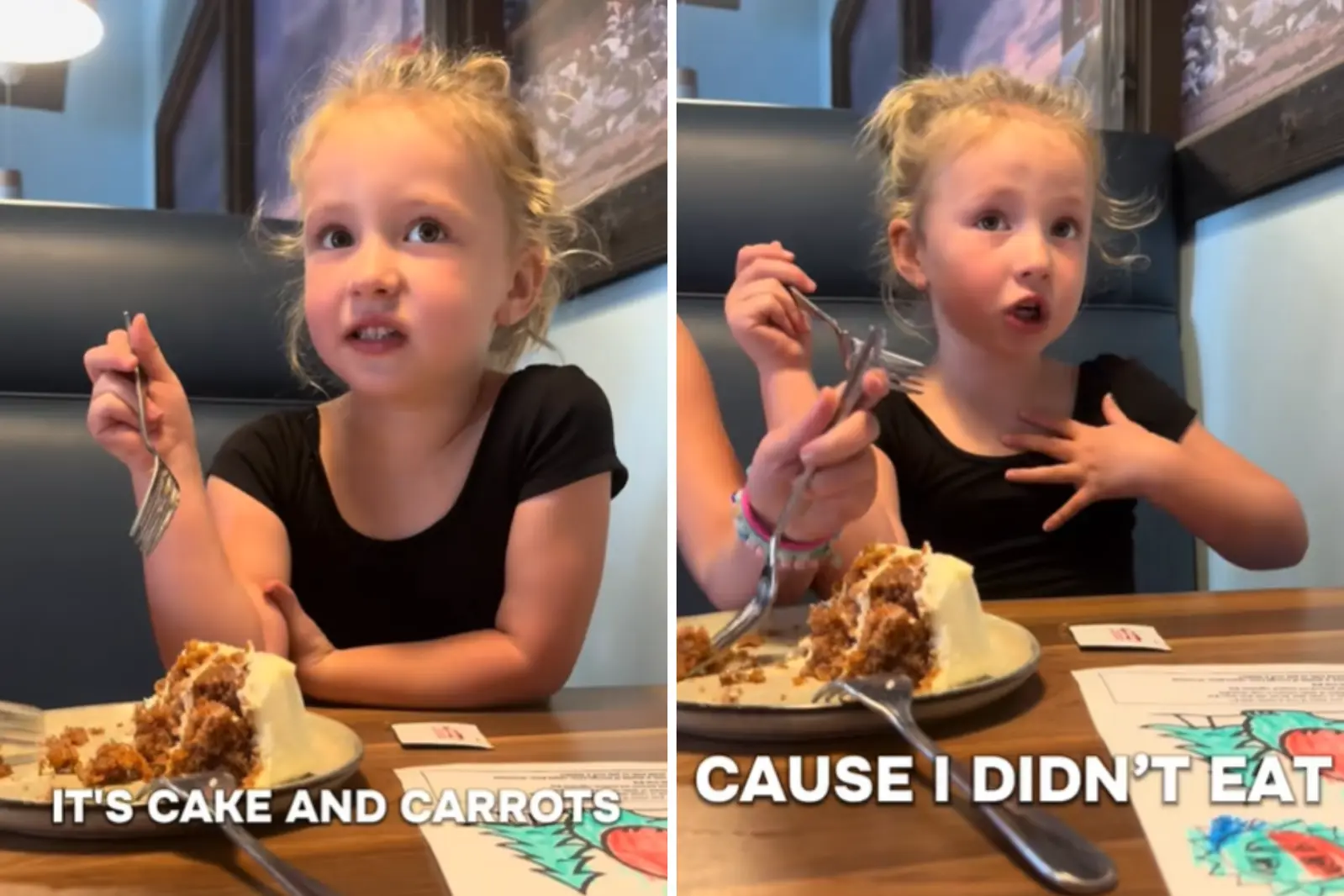“It’s cake and carrots, so carrots is healthy for you!” she explains to her mom, claiming the entire slice would surely make her “belly feel better.”
